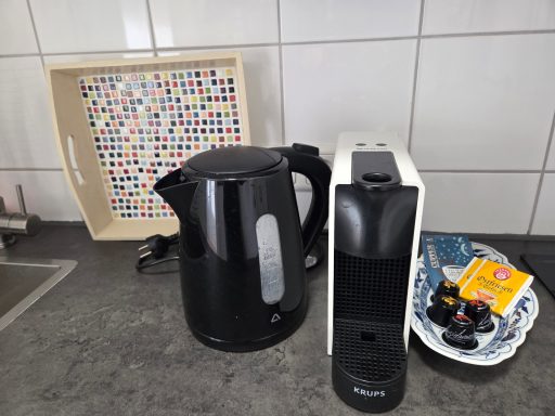 Ausstattung der Küche im Detail: Herd mit zwei Platten, Kühlschrank inkl. Gefrierfach, Mikrowelle, Wasserkocher, Toaster, Kaffeemaschine (Kapseln) und Milchaufschäumer.