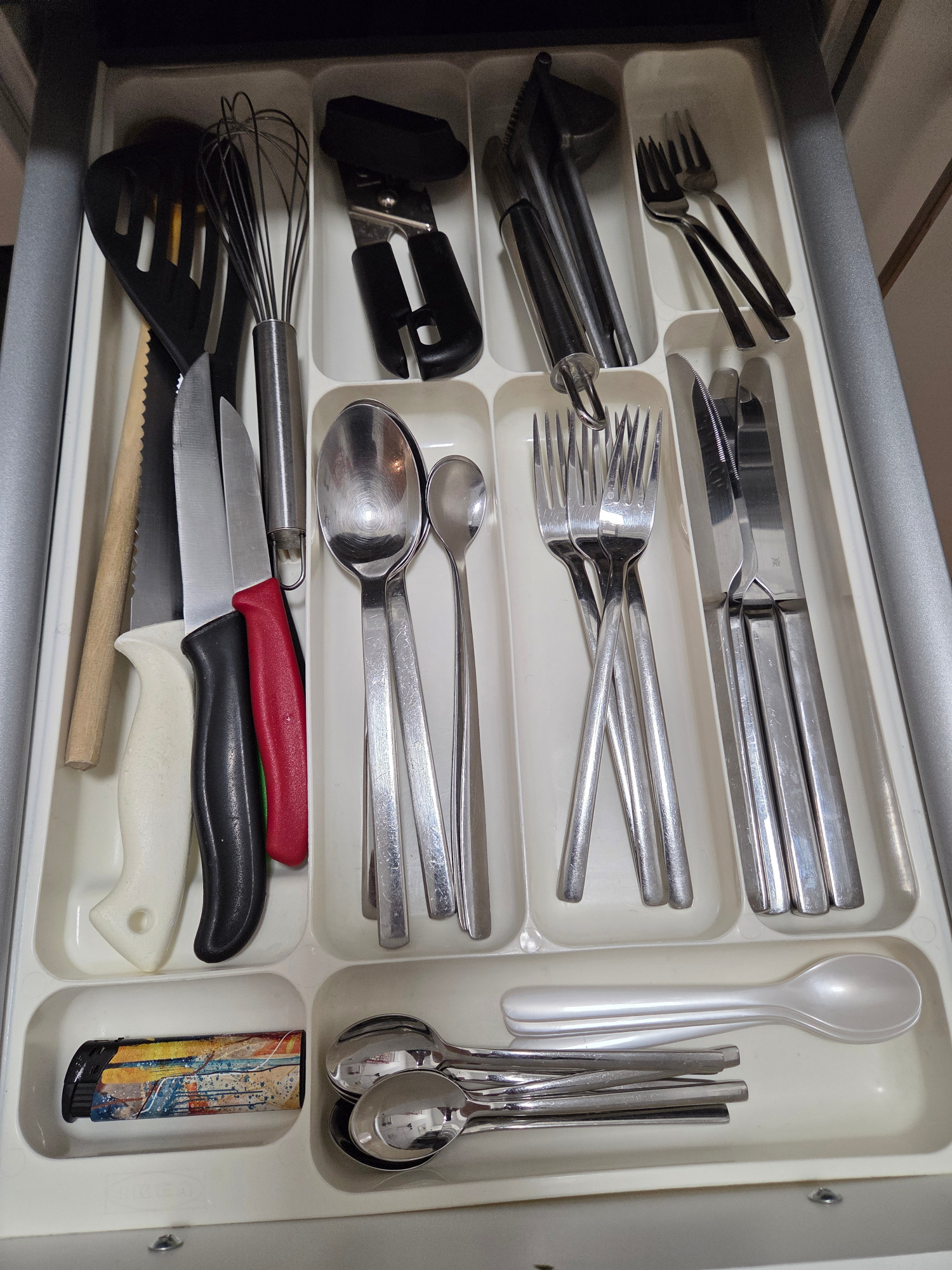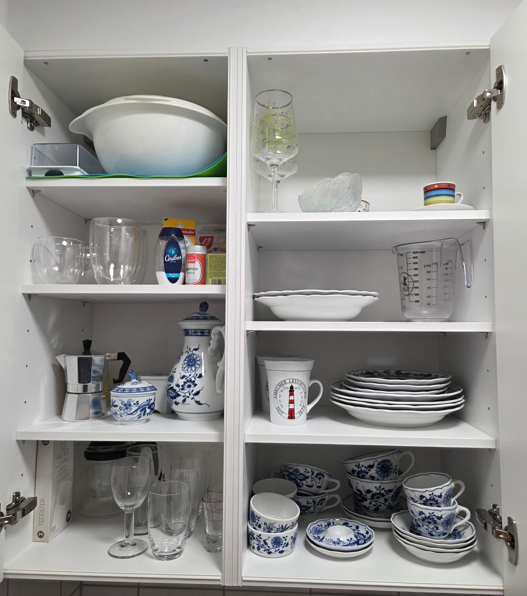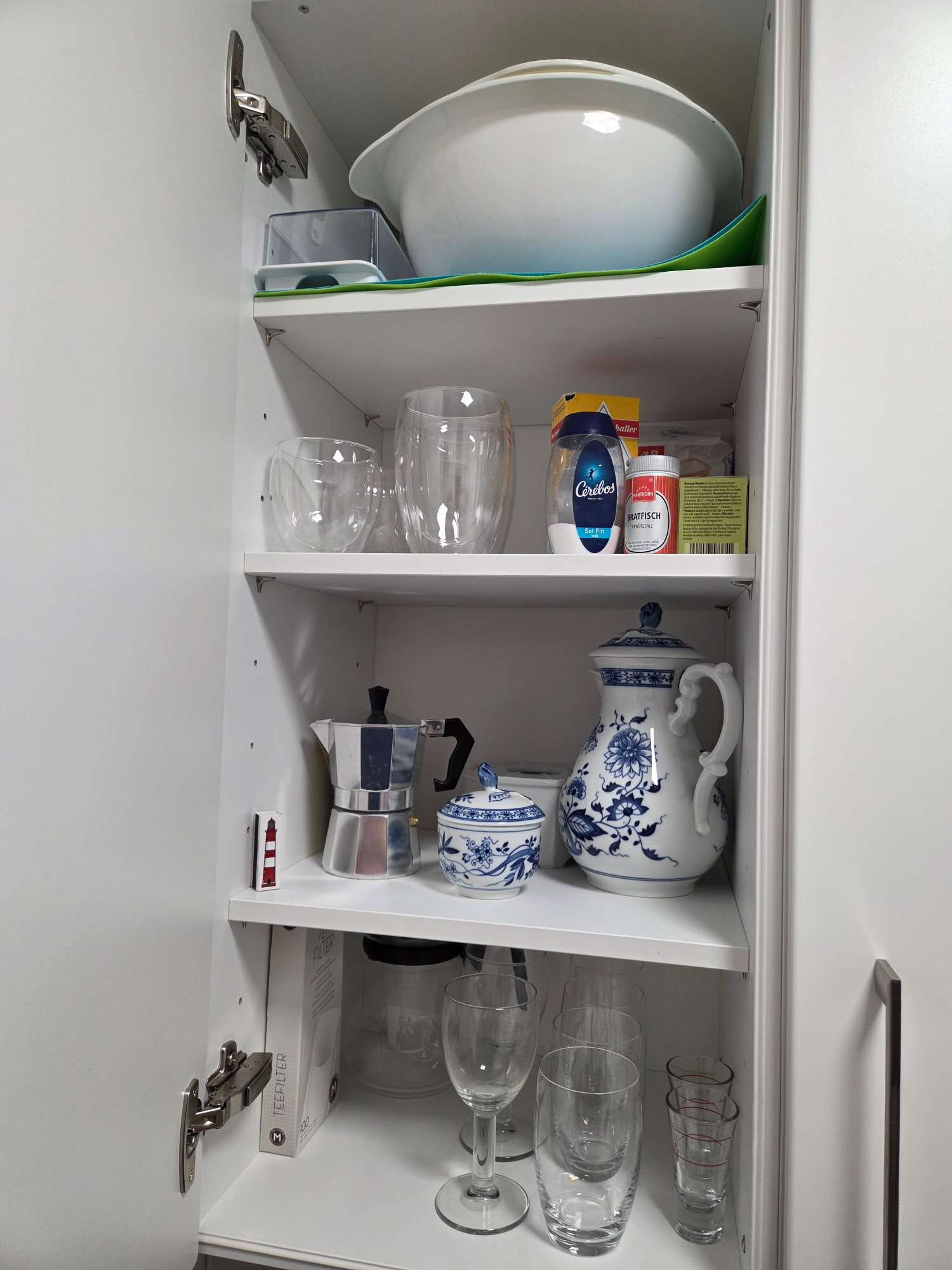 Geschirr und Besteck für 4 Personen, Töpfe, Pfannen, Schüsseln sowie Mikrowellengeschirr.